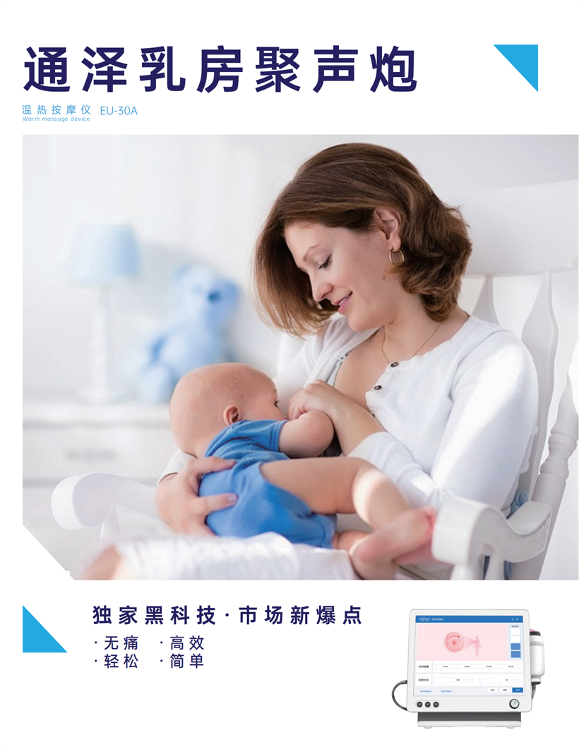 通澤乳房聚聲炮,獨家黑科技市場新爆點,深度聚焦產(chǎn)后缺乳調(diào)理、乳脹調(diào)理、乳腺保養(yǎng)、乳房塑形、淤積疏通、疤痕軟化等客戶的多樣化需求,利用低強度聚焦聲波技術(shù),實現(xiàn)無痛、高效、輕松、簡單的產(chǎn)后乳房護理,真正滿足客戶對產(chǎn)后乳房護理的需求和預期。